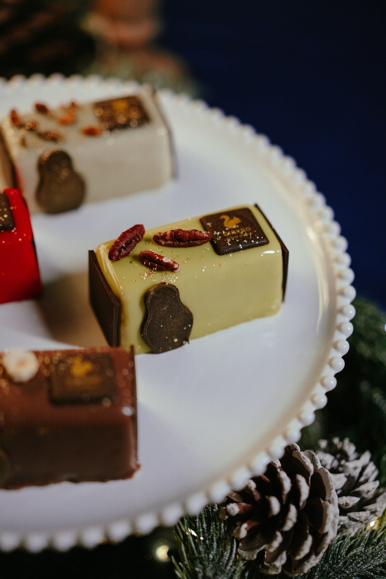 Sous son manteau se dévoilent une mousse fromage blanc légère, un insert citron bergamote frais, un crémeux miel réconfortant, un biscuit carrot cake et 4 épices moelleux, des noix de pécan torréfiées croquantes et un croustillant noix de pécan très gourmand.