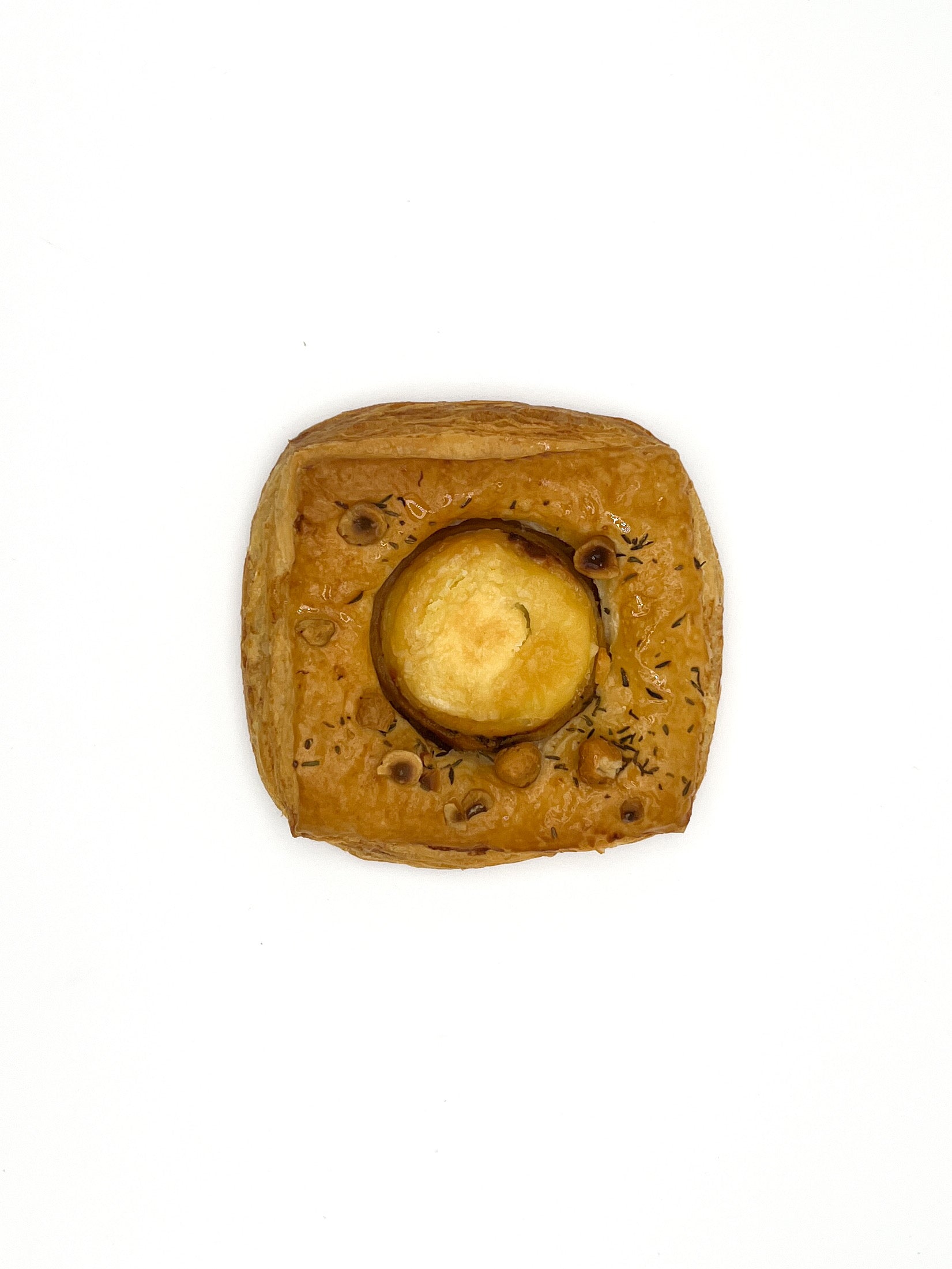 Viennoiseries salée très gourmande composée de pâte à croissant, pomme rôtie au four, crottin de Chavignol, noisettes torréfiées, miel et thym