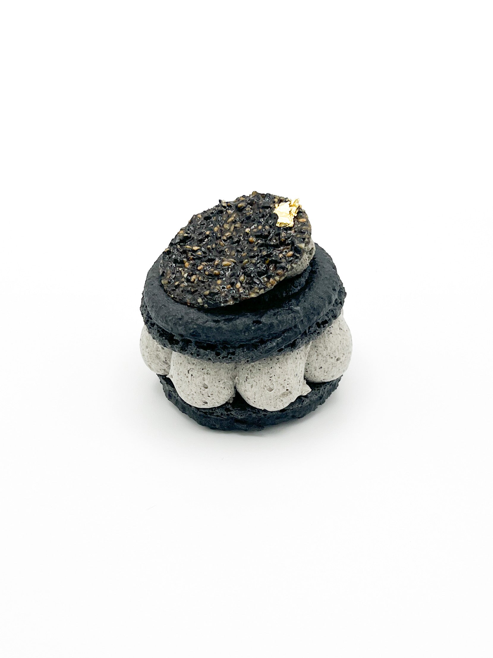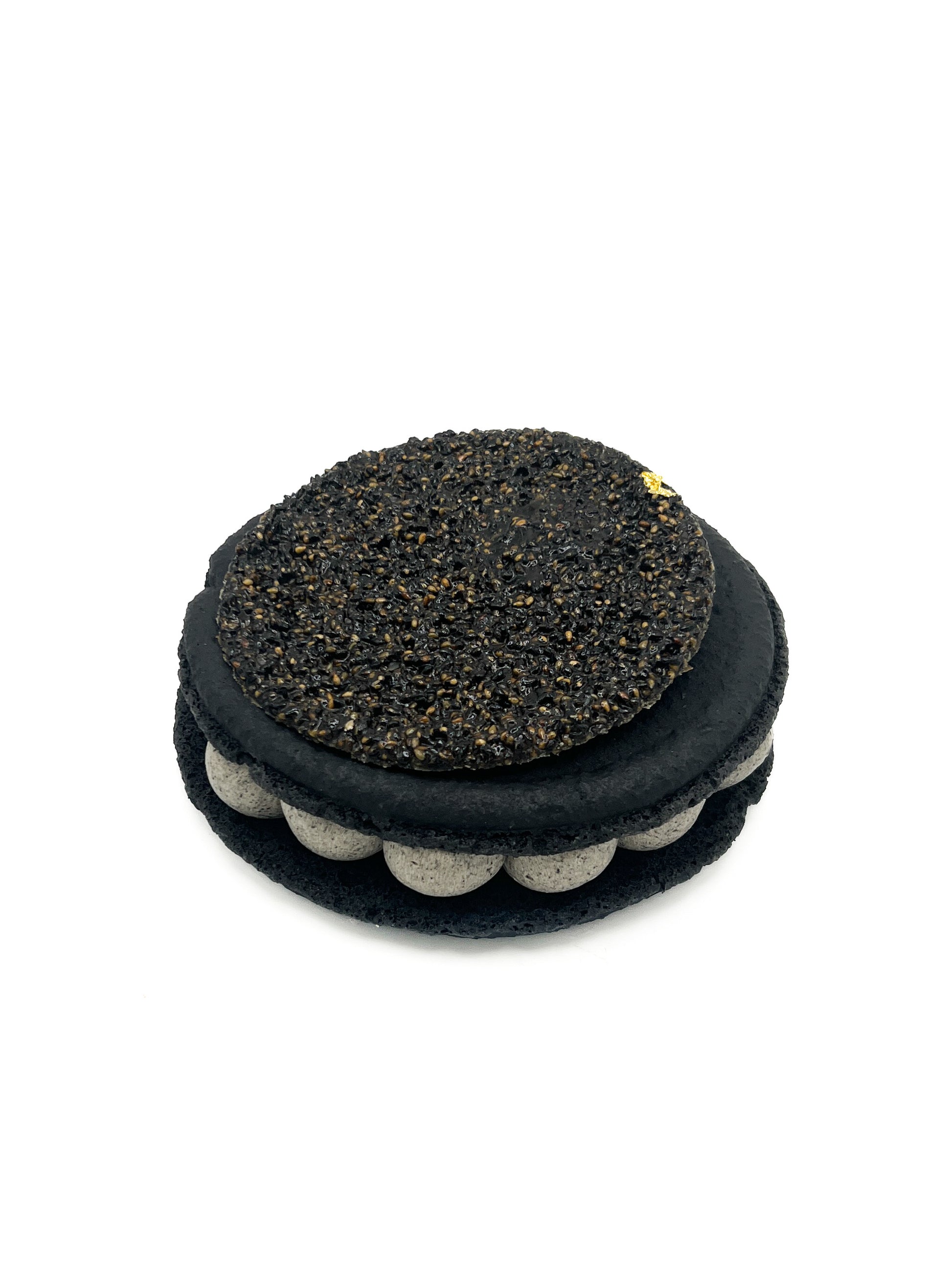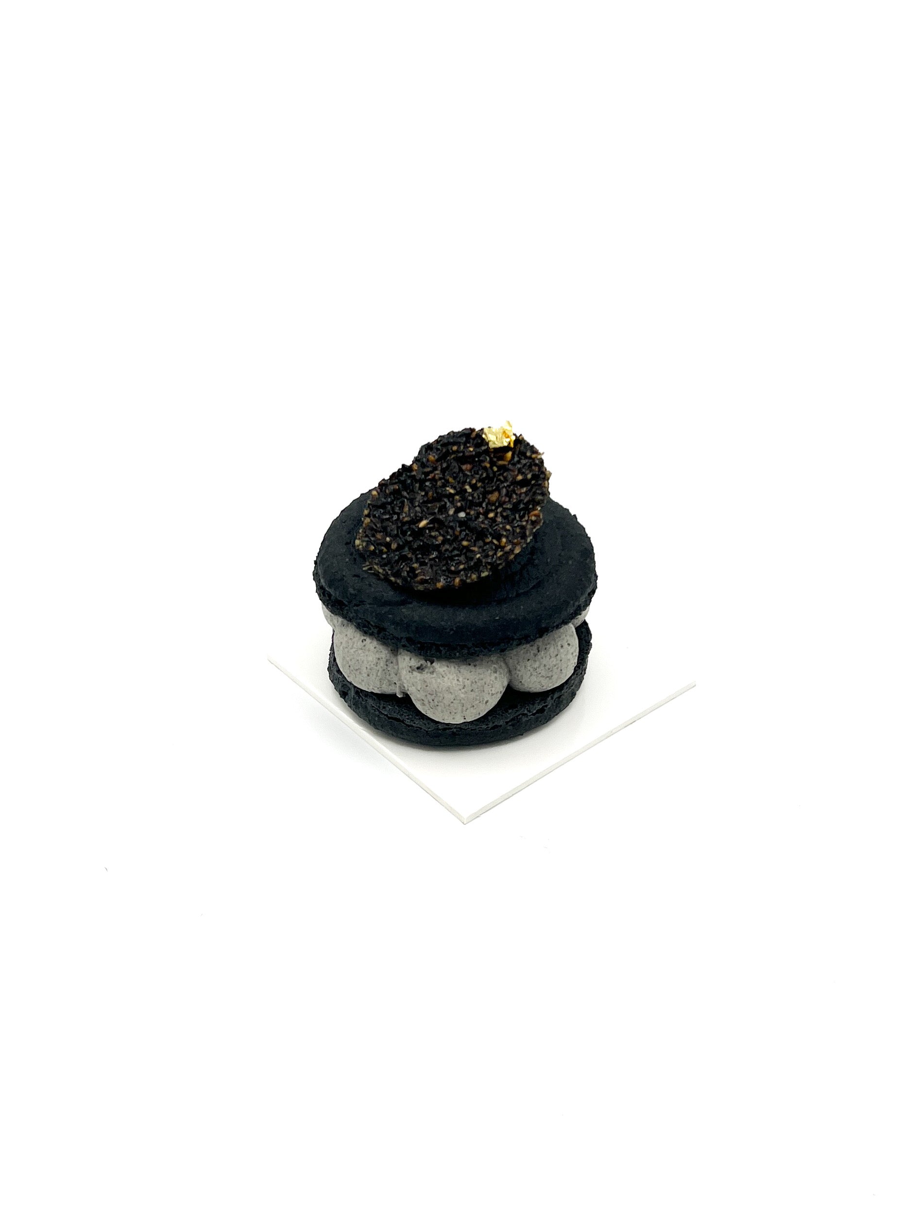 Biscuit macaron, mousseline de sésame noir, insert mangue et passion, tuile sésame noir