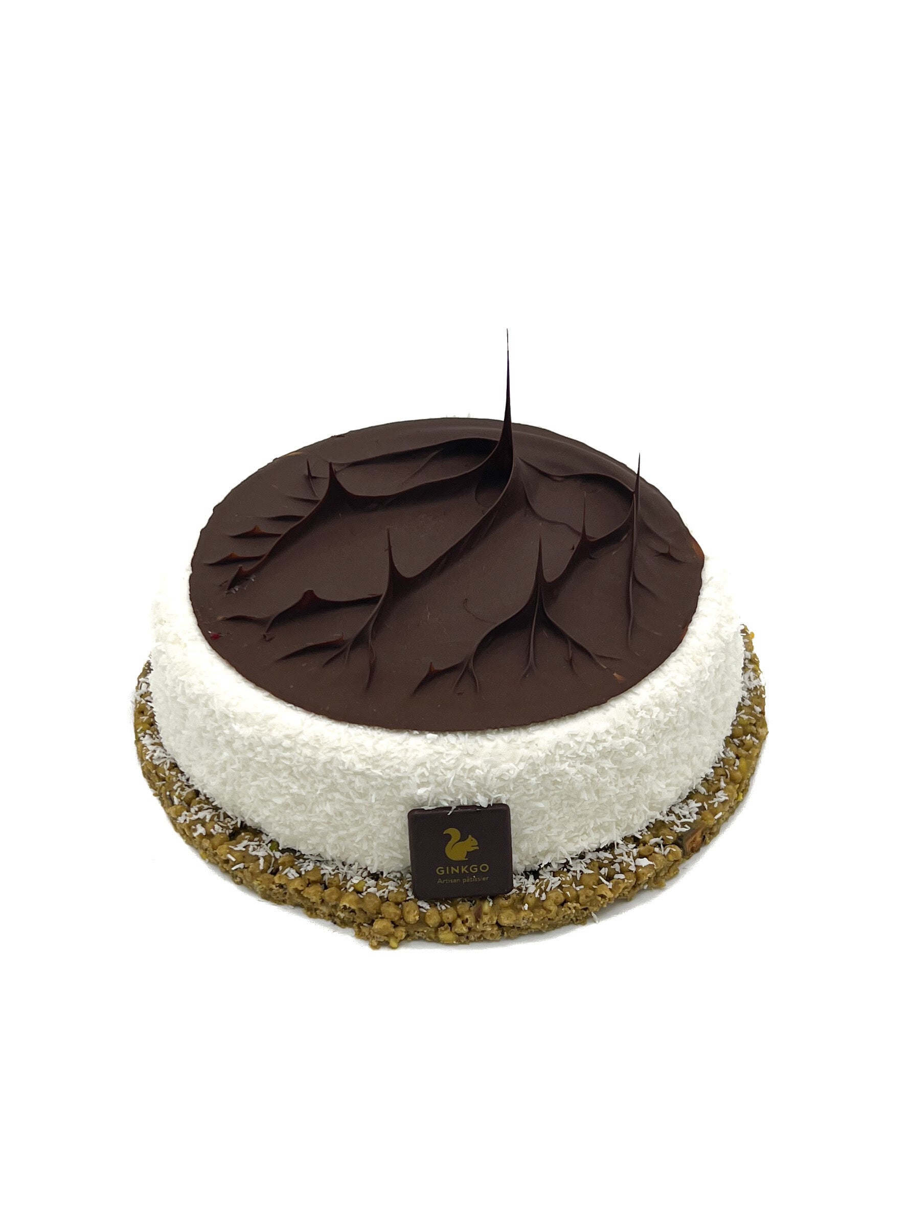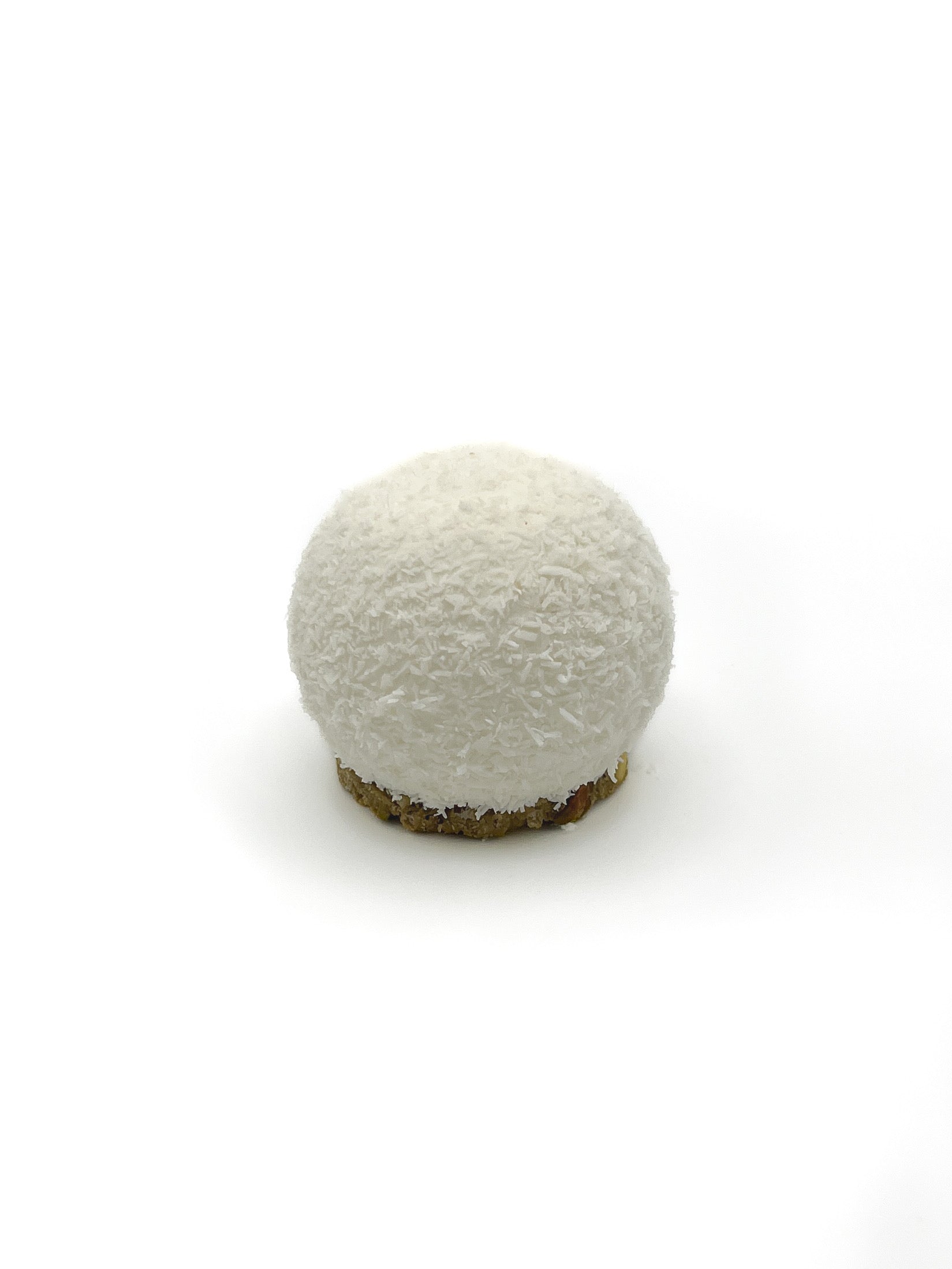 Mousse coco, insert framboise, biscuit « bounty », croustillant riz soufflé pistache