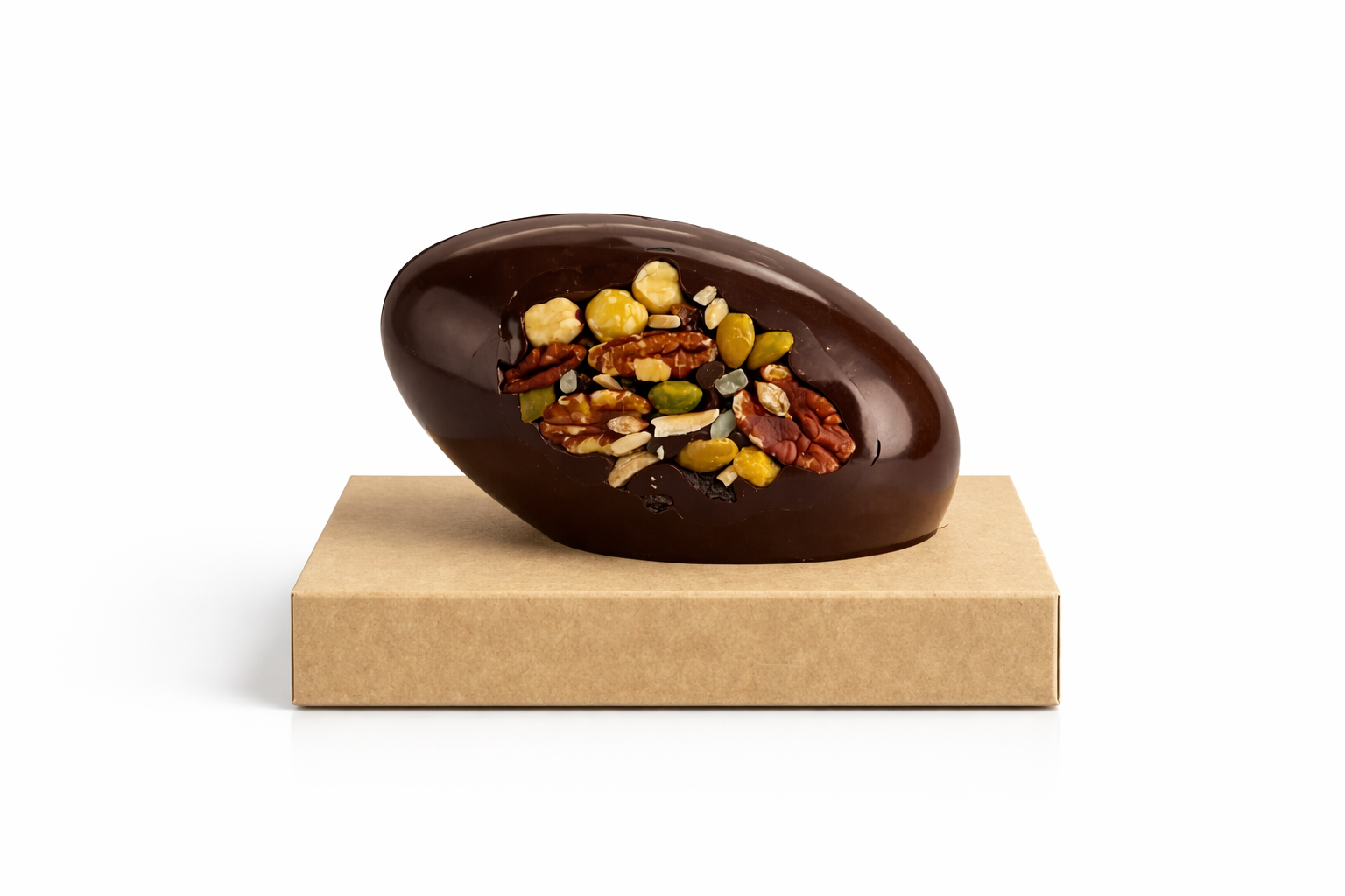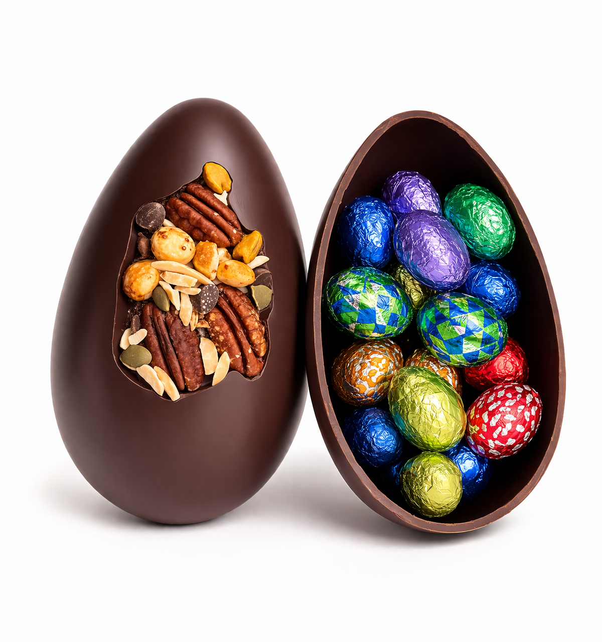 Œuf de Pâques façon mendiant réalisé par nos pâtissiers en chocolat noir Caraïbe Valrhona et fruits secs. Le tout garni d’une dizaine de petits œufs pralinés !
