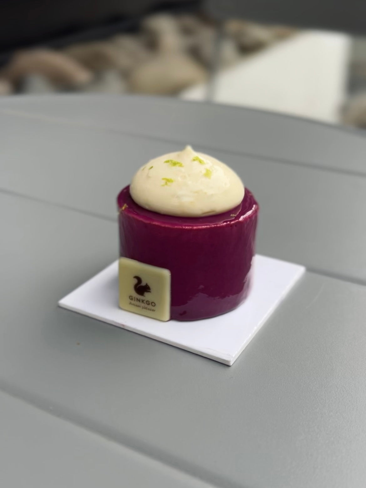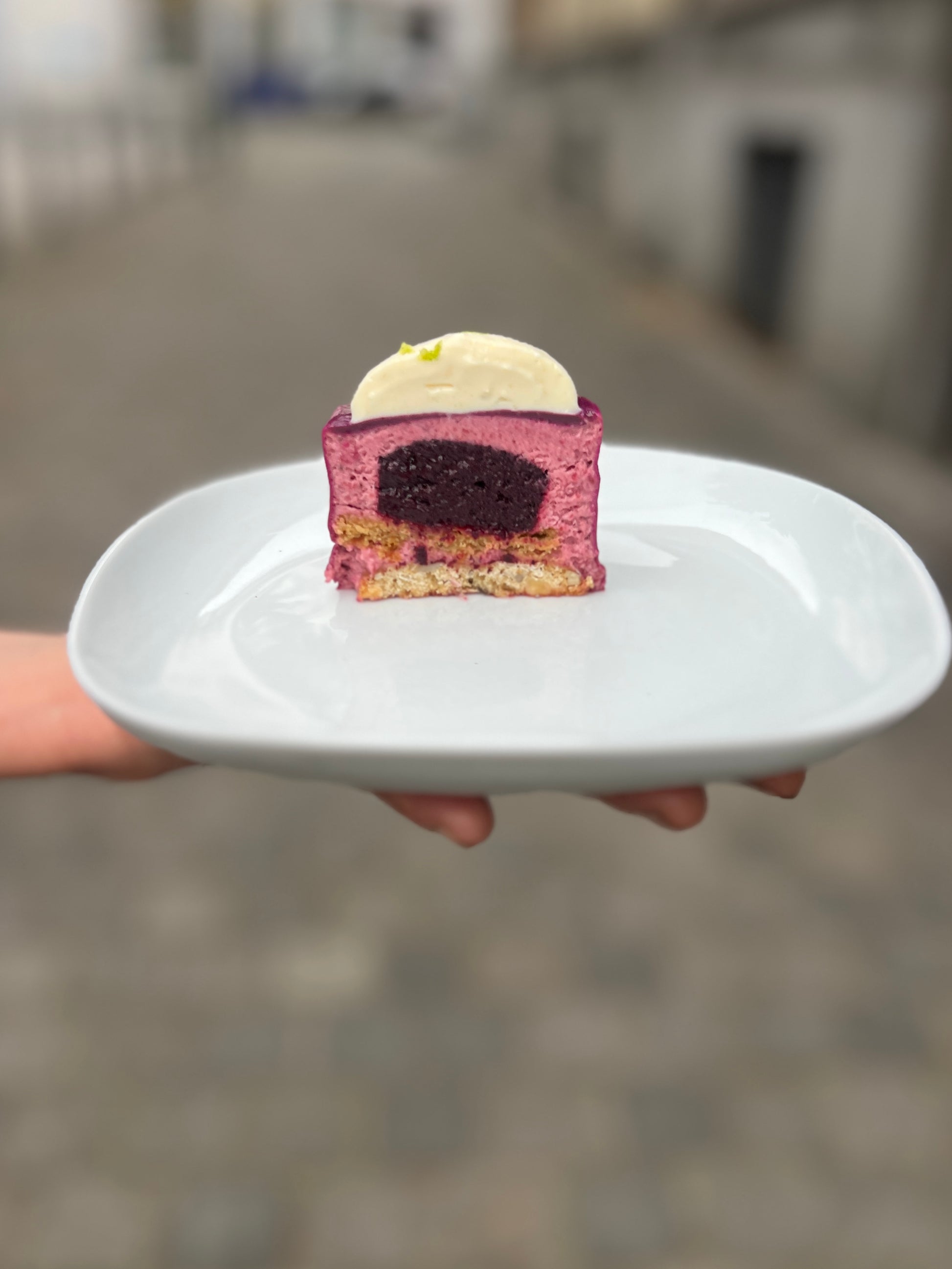 Sous sa robe rose tendre se cache une mousse à la betterave, un insert à la myrtille, un biscuit moelleux à la noisette, et un sablé granola surmonté d’une mousse fromage blanc citronnée.